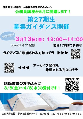 生協の公務員講座が【5月半ば】に開講します。 受講対象は、新2年生・新3年生・新大学院1年生の皆さんです。 3/13(金)に講座の詳しい説明や公務員試験について、お話をさせていただきます。 もし皆さんが、この講座で公務員 …